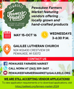 « All Events This event has passed. Pewaukee Farmer’s Market September 11, 2024 @ 3:00 pm - 6:30 pm CDT « Coffee Connection this is open to anyone in Pewaukee Merchant Meeting » Add to calendar Google Calendar iCalendar Outlook 365 Outlook Live Details Date: September 11, 2024 Time: 3:00 pm - 6:30 pm CDT Venue Galilee Lutheran Church N24W26430 Crestview Dr Pewaukee, WI 53072 United States + Google Map