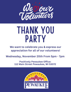 « All Events This event has passed. Volunteer Thank you party November 20, 2024 @ 5:00 pm - 7:00 pm CST « First Ever Pewaukee Wine Walk Pewaukee Businesses Christmas Party » Add to calendar Google Calendar iCalendar Outlook 365 Outlook Live Details Date: November 20, 2024 Time: 5:00 pm - 7:00 pm CST Venue Positively Pewaukee 112 Main Street Pewaukee, WI 53072 United States + Google Map Phone 262-695-9735 View Venue Website